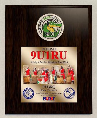 Плакетка "BURUNDI 2025 9U1RU" выдается за связи с российской командой "Russian DXpedition Team", которая активна в эфире из республики Бурунди до 17 ноября 2025 под позывным 9U1RU.
