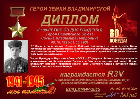 Диплом «К 100-летию со дня рождения Героя Советского Союза Сосина В.П.» учрежден Владимирским областным радиоклубом и посвящен 100-летию со дня рождения Героя Советского Союза Сосина Владимира Петровича – командира пулемётного взвода 1281-го стрелкового ордена Александра Невского полка (60-я стрелковая Севская Краснознаменная ордена Суворова дивизия, 47-я армия, 1-й Белорусский фронт), лейтенанта.