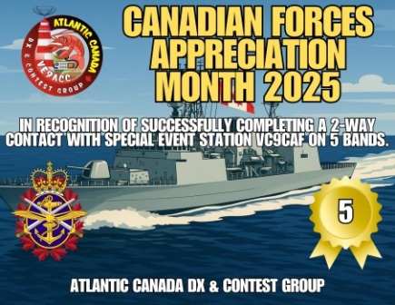 В честь канадских вооруженных сил, в честь храбрых мужчин и женщин канадских вооруженных сил, Atlantic Canada DX & Contest Group (ACDXG будет работать специальный позывной VC9CAF из Канады